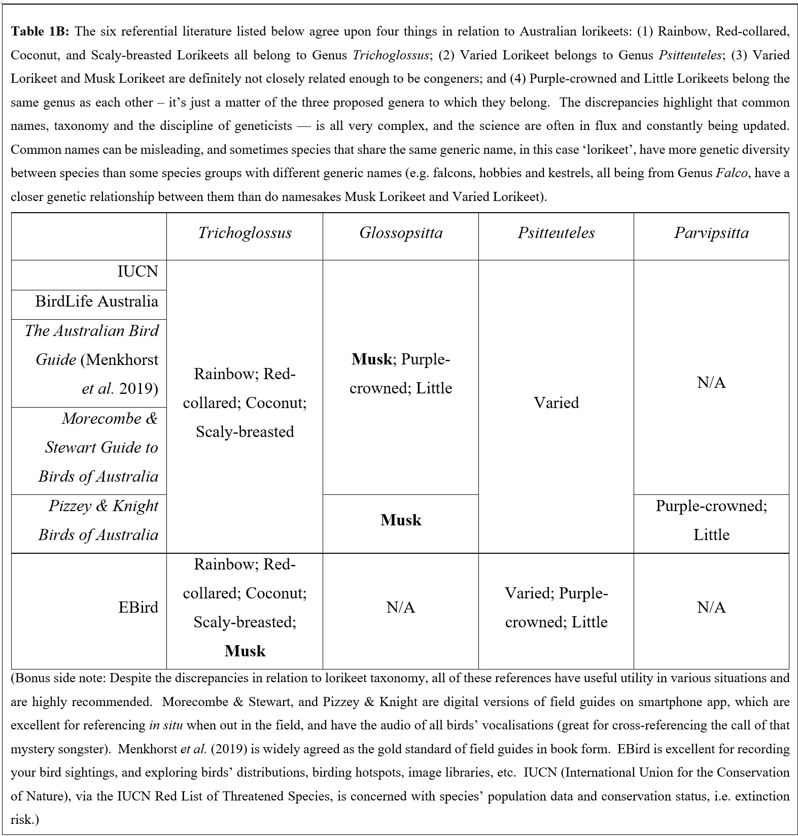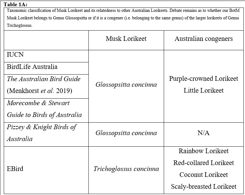 Scarcely larger (20-23cm) than a Budgerigar, the Musk Lorikeet is one of eight species of lorikeet in Australia (including the Coconut Lorikeet of the Torres Strait Islands). There is much ambiguity as to the genetic relationships between the Australian lorikeets, including that of Musk Lorikeet (refer to Table 1A/1B). One thing that defines all lorikeets is that they are all brightly coloured parrots with a brush-tipped tongue, which is specialised for feeding on nectar (i.e. nectarivores sugar high!). Feeding on nectar often means that pollination services are carried out by lorikeets. Whether locally indigenous eucalypts, Aussie natives from another region, or non-native trees, lorikeets are very nomadic in search of flowering and fruiting vegetation. Musk Lorikeet, while still nomadic, is considered to be “more seasonal and predictable than other lorikeets in its search for nectar”. The species also eats lerp and scale insects.